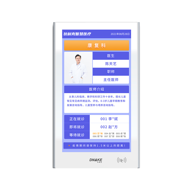 每個(gè)診室部署一臺(tái)液晶顯示終端,顯示出診專家(出診???、健康宣教等)信息,診室叫號(hào)時(shí)全屏(或分屏)顯示需就診患者信息。