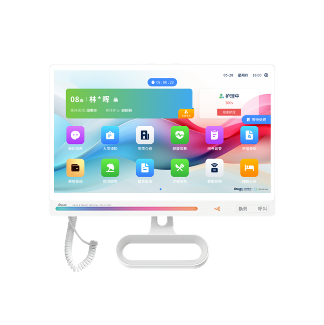 安裝在病床旁的支架或者搖臂上,用于顯示患者各項(xiàng)信息和報(bào)告,便于醫(yī)生和患者查看,具備各項(xiàng)娛樂功能,也可做娛樂設(shè)備試用,減輕患者住院焦慮。 軟件參數(shù):1)采用多點(diǎn)觸控電容觸摸屏,超薄面板,含手持呼叫手柄,安裝在病床上方的多功能擺臂上,每個(gè)病床一臺(tái),用于呼叫護(hù)士站,患者基本信息展示。2)支持呼叫/解除:可向護(hù)士站主機(jī)呼叫與解除呼叫。3)支持對(duì)講:可與護(hù)士站主機(jī)、病