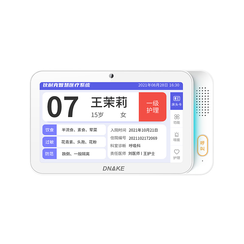 安裝在病床頭的交互設(shè)備機(jī),代替?zhèn)鹘y(tǒng)紙質(zhì)卡。產(chǎn)品支持呼叫對(duì)講、為住院患者提供病例查詢(xún)、狀態(tài)自動(dòng)提醒等護(hù)理需求等。