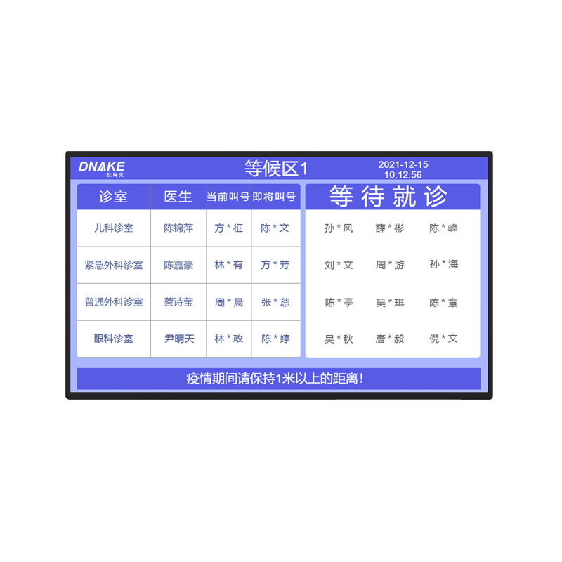 安裝在門診等候大廳,用于隨時(shí)得知患者等候科室的叫號(hào)順序,便于患者提前準(zhǔn)備前往科室,緩解患者在等候過程中的焦慮情緒。
