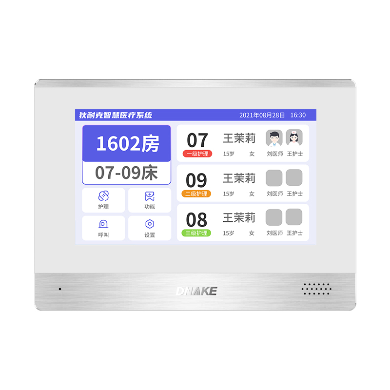 設置在病房門口的終端設備,主要用于顯示病房相關信息,內置簡易醫(yī)護工作站,支持病房床位一覽、患者動態(tài)跟蹤、呼叫對講、增援求救等多種呼叫類型,信息齊全,及時響應醫(yī)護需求,實現(xiàn)智能化醫(yī)護管理。
